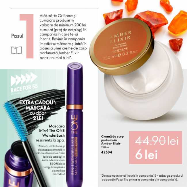 Alătură-te Oriflame şi cumpără produse în valoare de minimum 200 lei cumulat (preţ de catalog) în campania în care te-ai înscris. Revino în campania imediat următoare și intră în posesia unei creme de corp parfumată Amber Elixir pentru numai 6 lei*.