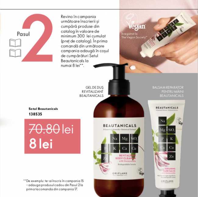 Revino în campania următoare înscrierii și cumpără produse din catalog în valoare de minimum 300 lei cumulat (preţ de catalog). În prima comandă din următoare campania adaugă în coșul de cumpărături Setul Beautanicals la numai 8 lei**.