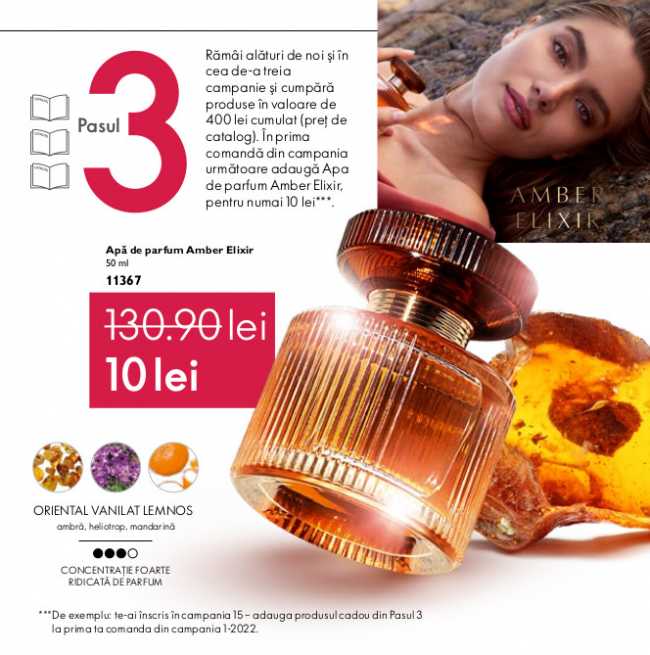 Rămâi alături de noi şi în cea de-a treia campanie şi cumpără produse în valoare de 400 lei cumulat (preţ de catalog). În prima comandă din campania următoare adaugă Apa de parfum Amber Elixir, pentru numai 10 lei***.
